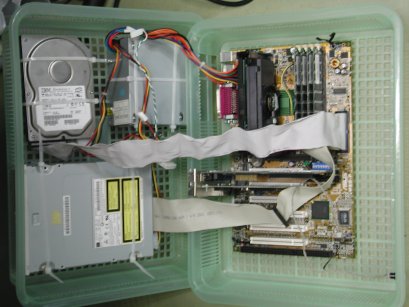 部品は使わなくなったPentium-IIIのもの。サーバとしてつけっぱなしにして2~3年運用していたが電源のファンが壊れた以外は特に問題は無かった。 ご察しの通り作りが悪いので動かしたりするのがめんどうだった。