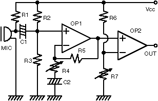 2回路入りのオペアンプ(LM358)を用い、コンデンサマイクからの信号を一段目のオペアンプで増幅し、2段目のオペアンプ(比較器を構成)で波形整形を行っている。